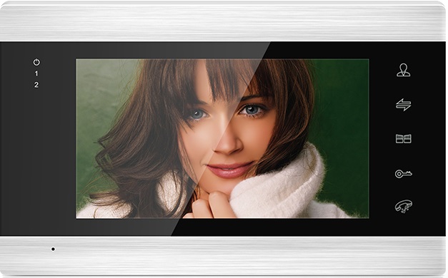 Wi-Fi видеодомофон оборудован дисплеем с диагональю 7 дюймов. Управление производится при помощи сенсорных кнопок, доступны функции записи фото и видео, регулировки яркости, цвета и контрастности, выбора мелодий. Домофон поддерживает SD-карты, объемом до 32 Гб. К домофону возможно подключить до 2-х вызывных панелей и 2 камер 2Мп(/AHD/TVI/CVI)/960H(CVBS).